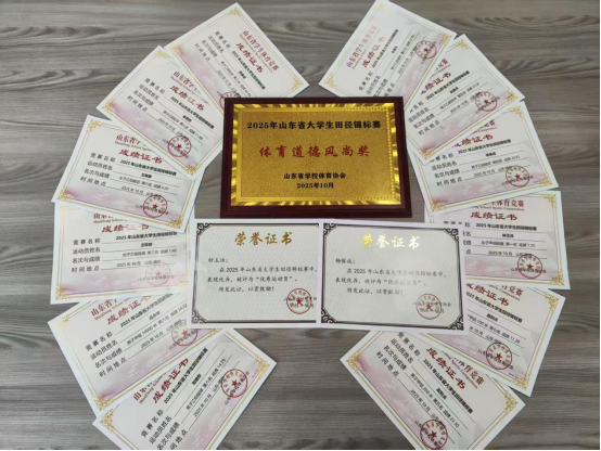 10月14日,2025年山东省大学生田径锦标赛在潍坊奥林匹克体育场落下帷幕。我校代表队在领队杨跃飞和教练员刘长亮、郭明群的带领下,不畏艰难,奋勇争先,最终获得1金、3铜的优异成绩,并在多个项目中斩获名次:共收获3个第五名、1个第四名、1个第六名、2个第七名和3个第八名。
